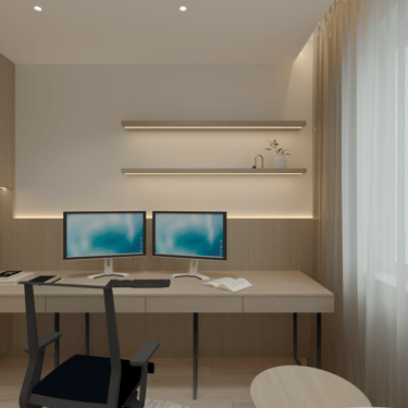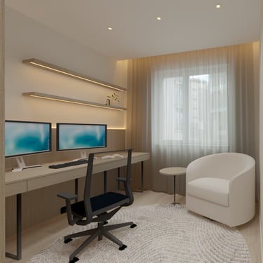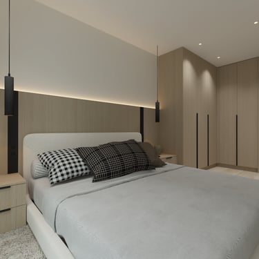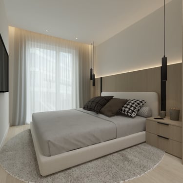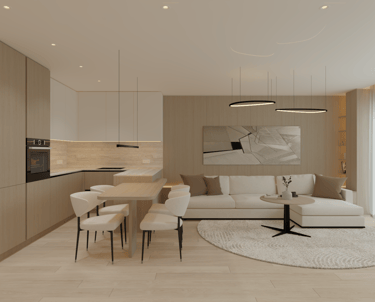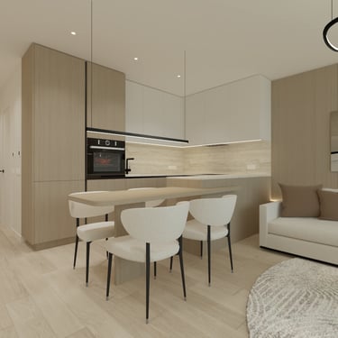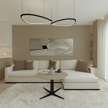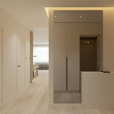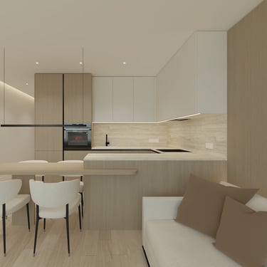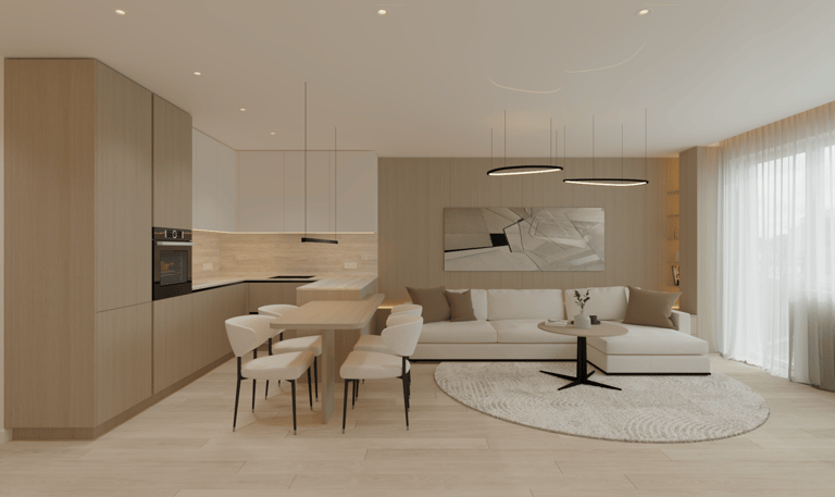 Šio interjero koncepcija paremta ramios, subalansuotos ir ilgaamžės gyvenamosios aplinkos kūrimu, kurioje dominuoja natūralios medžiagos, šviesa ir aiški erdvinė struktūra. Projektas orientuotas į kasdienį komfortą, estetinį švarumą ir funkcionalumą, vengiant trumpalaikių tendencijų. Interjere vyrauja šiltų neutralių tonų paletė – šviesus medis, smėlio ir pilkšvi atspalviai, subtiliai papildyti juodais akcentais. Tokia spalvinė schema kuria ramią, vizualiai neperkrautą aplinką, leidžiančią erdvei išlikti aktualiai ilgą laiką.