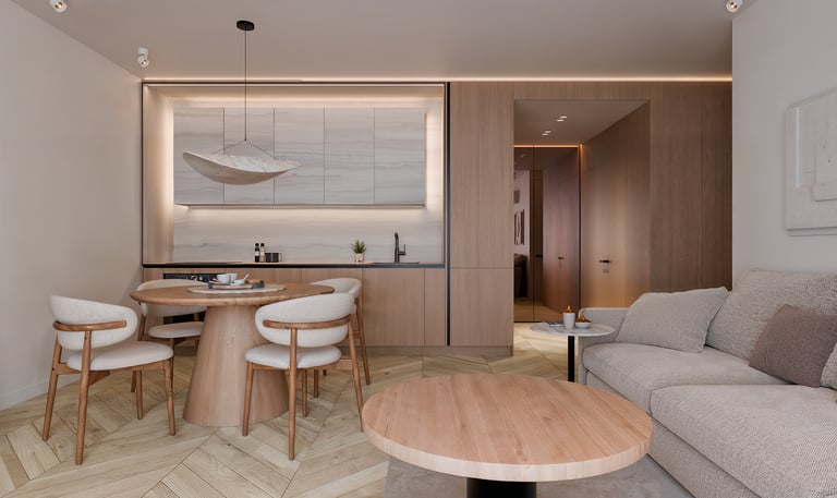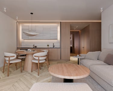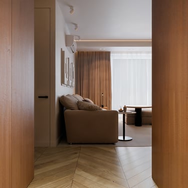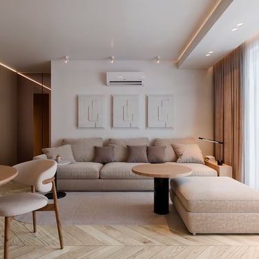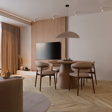 Šiltas, jaukus ir subtiliai prabangus interjeras, kuris remiasi minimalizmu, natūralumu ir funkcionalumu.